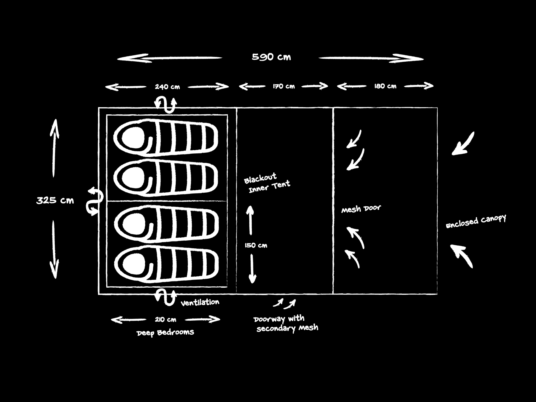 For night-time comfort, the tent features full blacked out bedrooms, preventing light penetration and helping everyone enjoy uninterrupted, restful sleep. Zipped window blinds give you full control over privacy and shading, allowing you to adapt easily to changing conditions. This includes zipped window Blinds in the front porch area as well.Â
