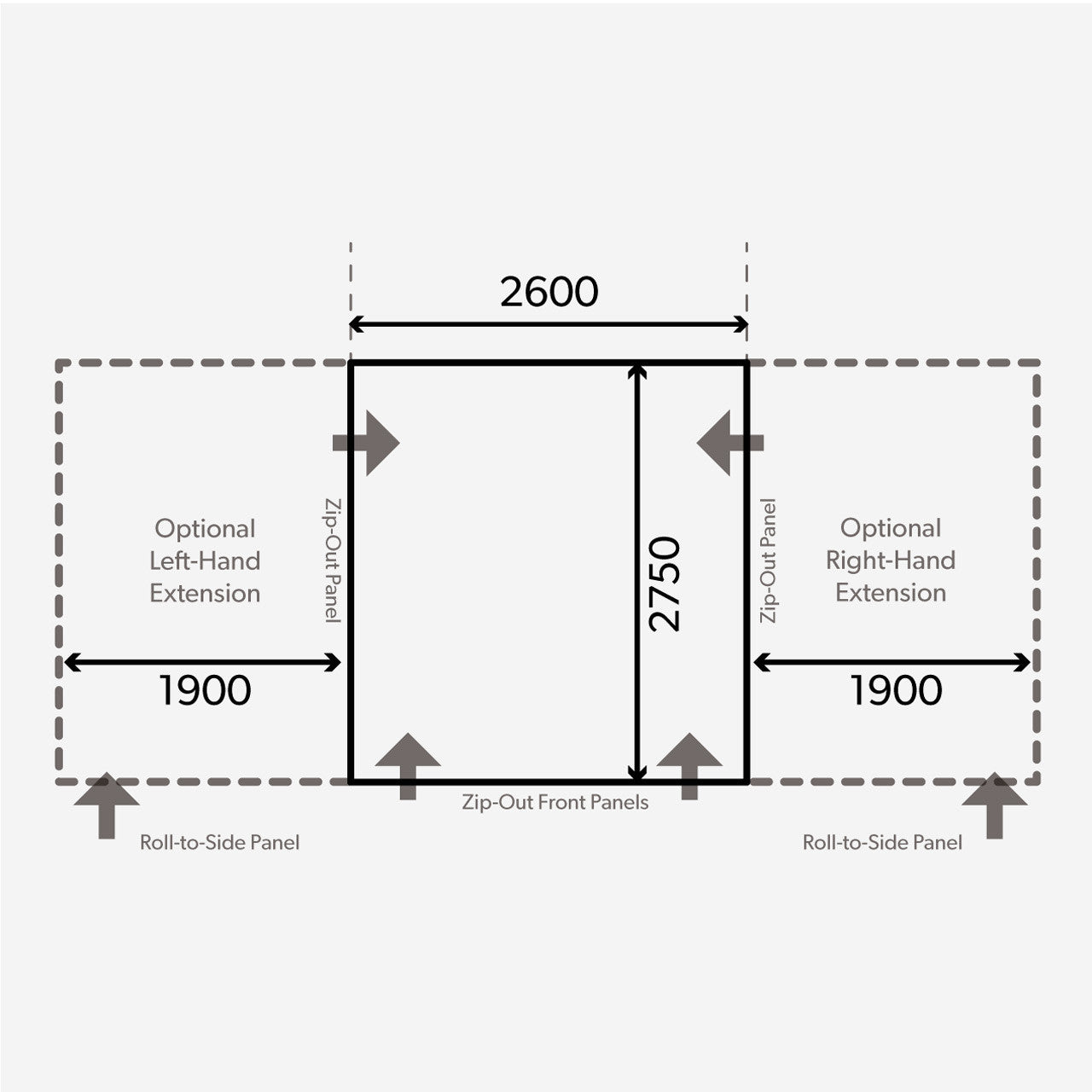 • Front and side panels can be zipped out to reduce weight and to open the awning up