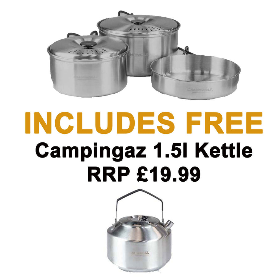 The Campingaz Camping Kit includes 2 saucepans with draining lids (18cm & 16cm), a 17cm frying pan with folding easy-grip handles . Its high-quality and durable stainless steel surface ensures efficient cooking. All items also nestle together for easy storage.